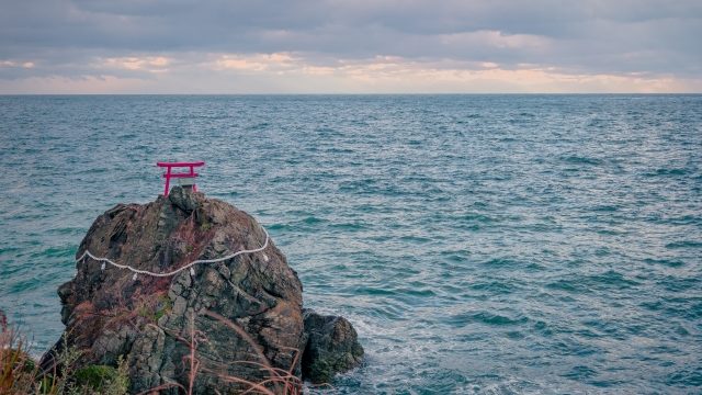 瀬戸内海に浮かぶ、綱掛岩と鳥居。