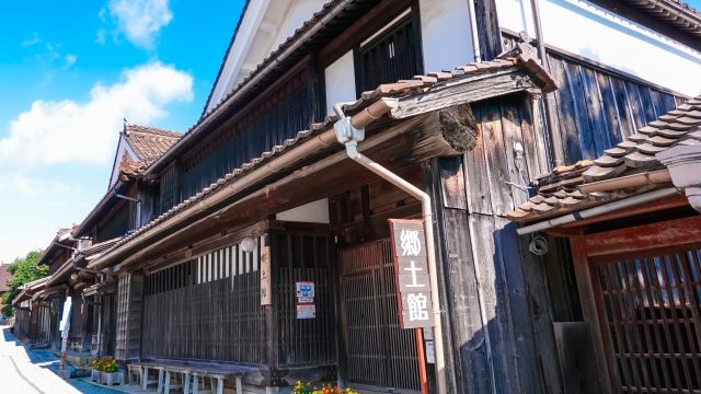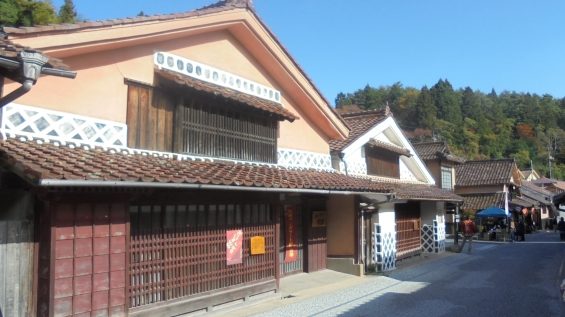 当時の豪商達が石州(現在の島根県)の宮大工に、石州瓦にベンガラ格子の家を造らせたことに始まります。