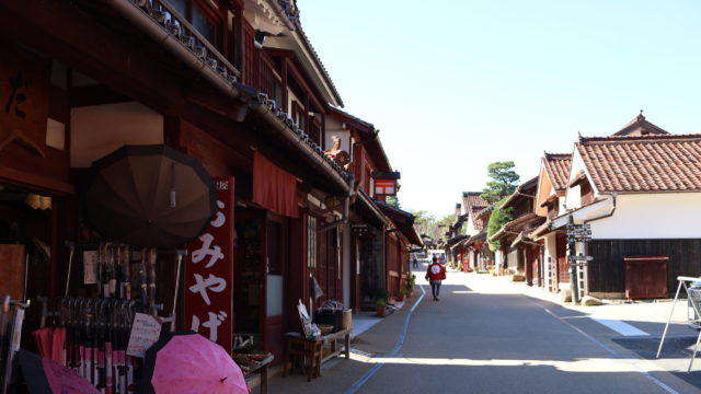 ゆっくりとしたスピードでベンガラの里を回りながら、建築物の説明、写真スポットの伝授、お食事処の紹介などを受けながら進みます。