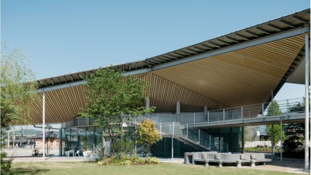 木造の美しいフォルムの屋根だったり、田んぼの真ん中に建造してみたりと、その土地を尊重し自然と融合した優しい印象です。